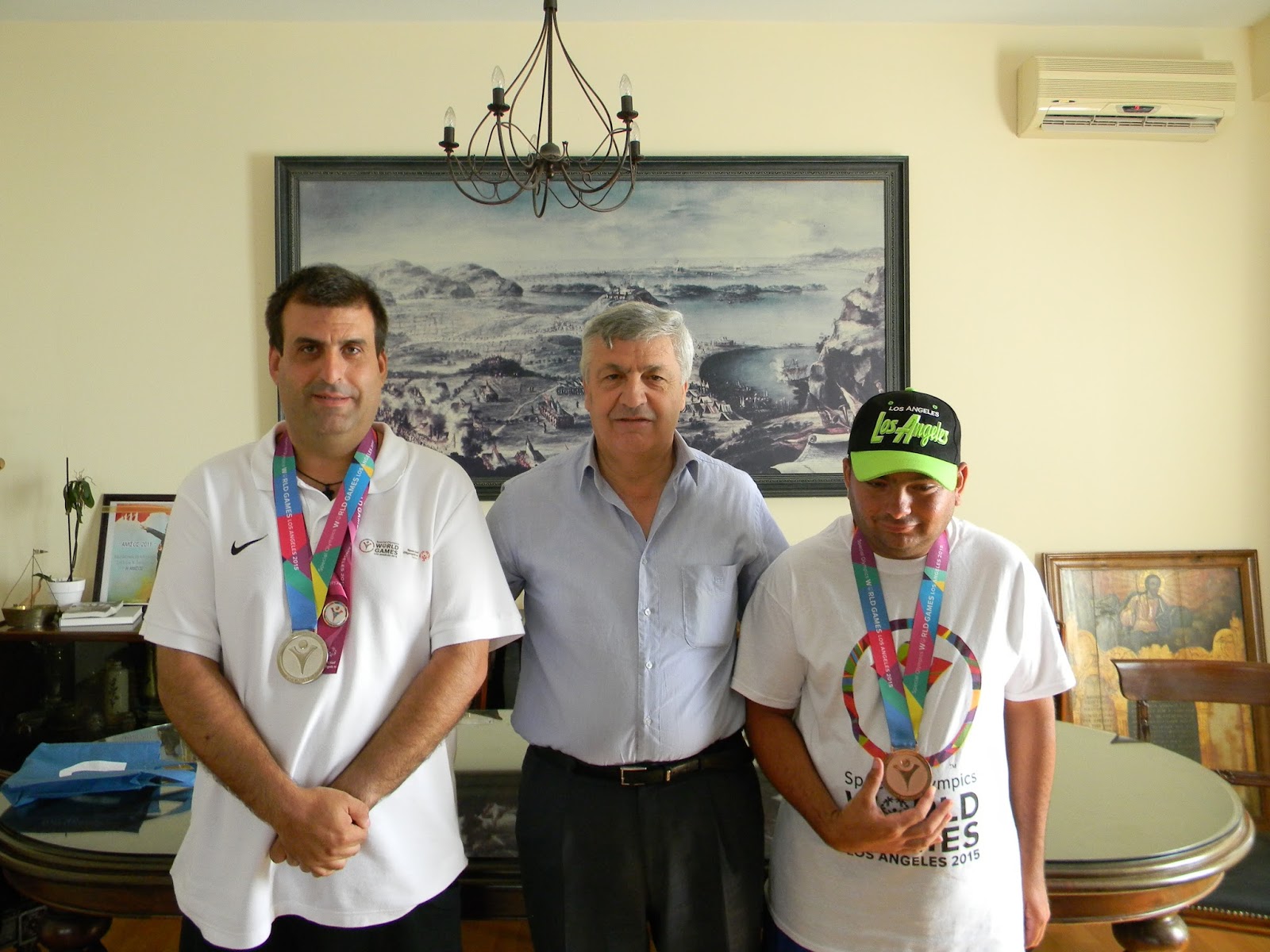 Σημερα στο Γραφειο του Δημαρχου παρουσια του εντεταλμενου για τον Αθλητισμο Δημοτικου Συμβουλου Κου Συγκουνα Ευαγγελου και του Επικεφαλη της Αντιπολιτευσης Δημ. Συμβουλου Αναπληρωτη Προεδρου της Ε.Ε. Ομοσπονδιας Τενις ( Ε.Φ.Ο.Α. ) και Προεδρου του Ομιλου Τενις Πρεβεζας Κου Παππα Δημητρη, συναντηθηκαν υστερα απο προσκληση του Δημαρχου με τους Βουκελατο Διονυση ( Αργυρο Μεταλλιο ) και Χρηστο Πακο ( Χαλκινο Μεταλλιο ) νικητες στους Special Olympics του Los Angeles στο αθλημα του Τενις.