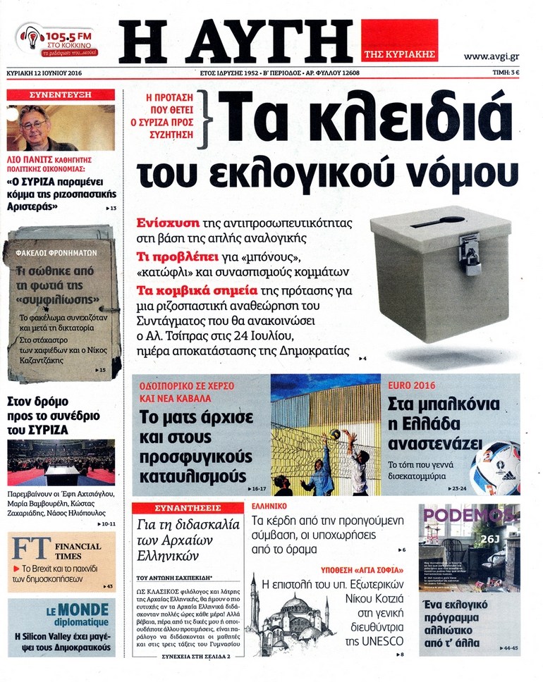 Τα πρωτοσέλιδα της Κυριακής 5-6-2016